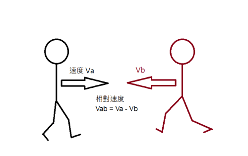 武術應用,兩人搭手;以物理的角度來說,就是兩人在一直線上相對前進(如圖一),不論是他衝過來或是我衝過去,兩者的相對速度都一樣: