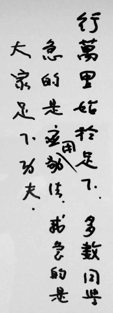 老師當年出國前,在復興南路道場寫下:「行萬里路始於足下,多數同學急的是應用勁法,我急的是大家足下功夫。」(圖三)老師多年來苦口婆心,常聽到老師說太極拳要下面指揮上面,裡面指揮外面。由下而上,由內而外,我常問自己:做到了多少?