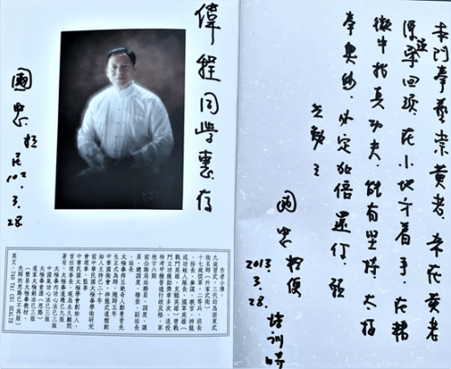 2013年三月底,入門未及半年,參加山莊的集訓結束後,我請吳師爺在書上簽名以留念,沒想意外得到師爺一段勉勵的話。短短一段話,幾年來,當習拳或做事情碰到瓶頸時,都會不自覺拿出來看看。每每看完後總生出莫名的勇氣,讓自己可以繼續向前走下去。師爺這段話如下: